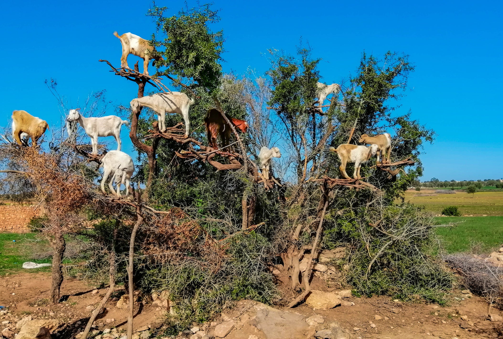 The argan tree is an endemic woodland species sometimes known as the "tree of life" because of its many health and beauty benefits. There are roughly 21 million trees that cover over 3,000 square miles of land (Morocco is slightly larger than California). They can grow up to 50 feet in both height and width and while it can take them 50 years to bear fruit, they can live for 200 years. One tree will produce about 100kg of fruit, which yields about 2L of oil.
