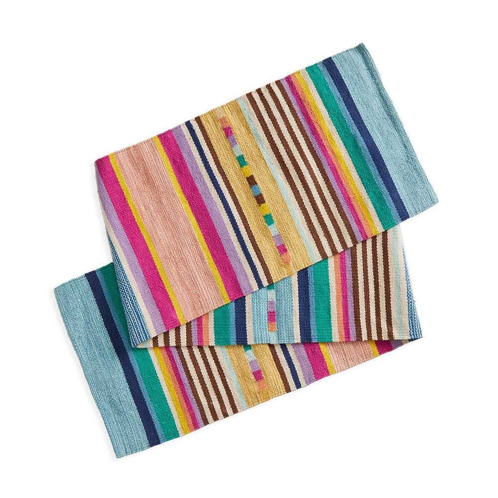 A festival of colors for your tabletop! Using fiber-reactive, azo-free dyes, fair trade artisans in India infuse hand-spun cotton thread with bright, festive colors, then weave this eco-friendly runner on a hand loom in vibrant stripes. 100% cotton. Dry clean recommended. 75" long x 14" wide.